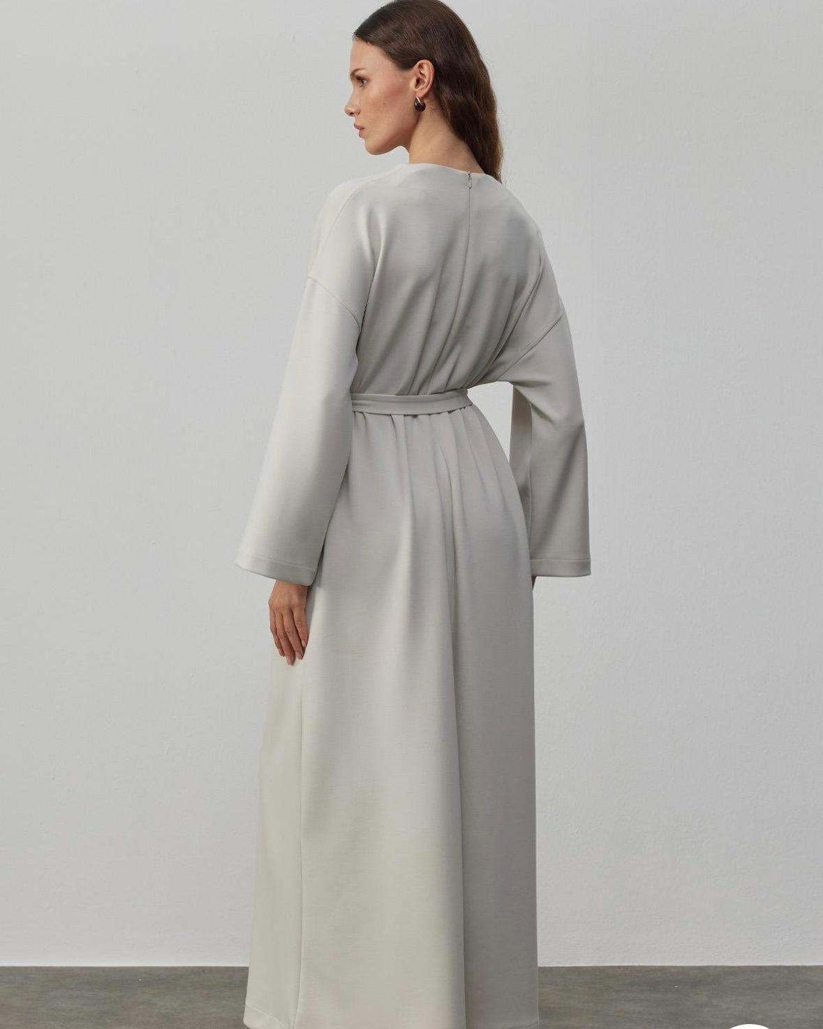 The loose fit is gently defined by a matching waist tie, allowing you to adjust the shape to your preference. Featuring a clean round neckline, long relaxed sleeves, and a flowing maxi-length skirt, this piece moves beautifully with the body while maintaining a minimalist, modern look.
