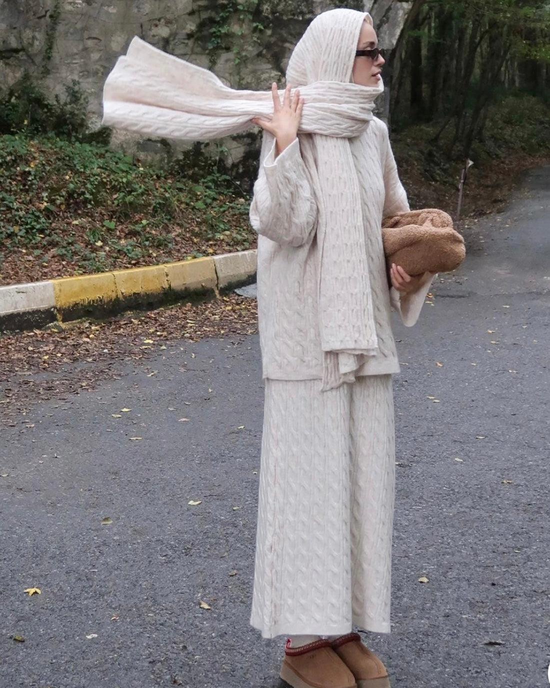 Elevate your wardrobe with our Premium 3-Piece Cable Knit Set, designed for timeless elegance and effortless comfort. This sophisticated set features a beautifully textured cable-knit top, a matching long skirt, and a coordinating shawl that adds both warmth and refinement.