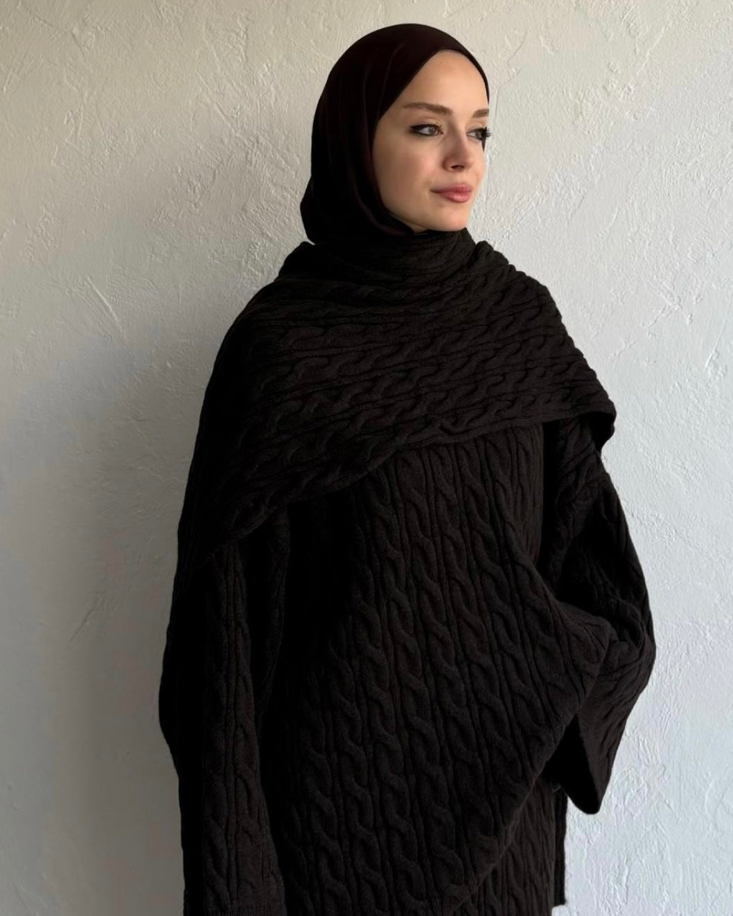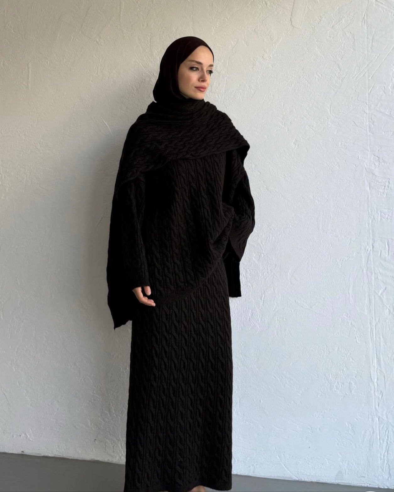 Crafted from high-quality knit fabric, the set offers a soft, cozy feel while maintaining a structured and luxurious look. The relaxed silhouette allows for graceful movement, making it perfect for both everyday wear and special occasions. Thoughtfully designed for a modest yet modern style, this set embodies understated luxury and versatility.