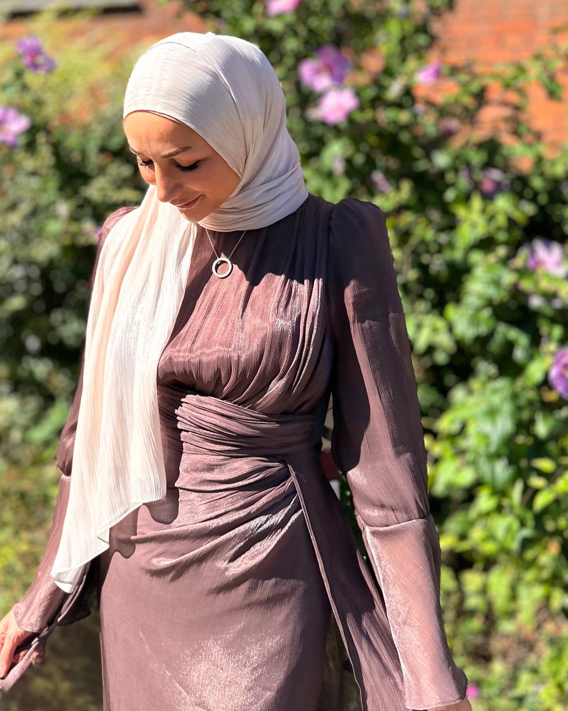 Sarah Collection's "Shiny Crincle Chiffon" er produceret i et let og løsvævet tekstil med et blødt greb og fint fald. Stoffet har et rillet tekstur og giver et unikt look med dens naturlige glans. Dette tørklæde er perfekt til fine begivender.