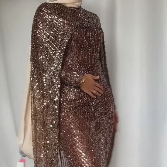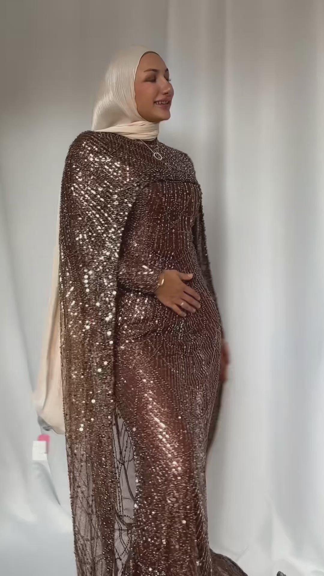 Covered in shimmering details and a beautiful pattern, the dress catches the light and delivers a glamorous effect. The cape flows gracefully along the body, adding an extra touch of exclusivity and fluid movement.
