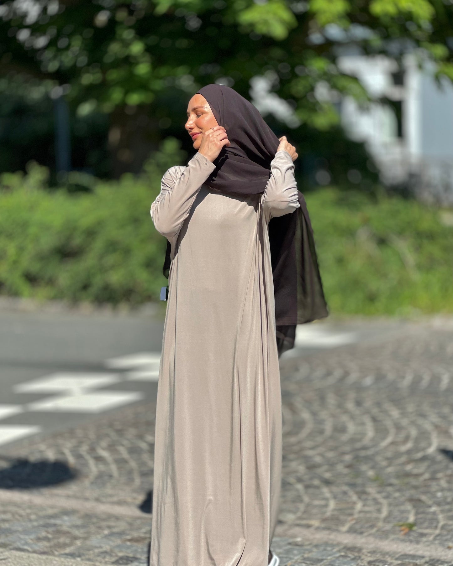 The abaya is crafted from lightweight and breathable fabric, ensuring it feels soft and gentle against the skin. Its high-quality material resists creasing, making it a low-maintenance yet stylish option. The tapered sleeves provide subtle definition to the overall silhouette, balancing the flowy design with a refined touch. The simplicity of the abaya allows it to be styled in various ways, whether dressed up with statement accessories or kept minimal for an understated, elegant look.