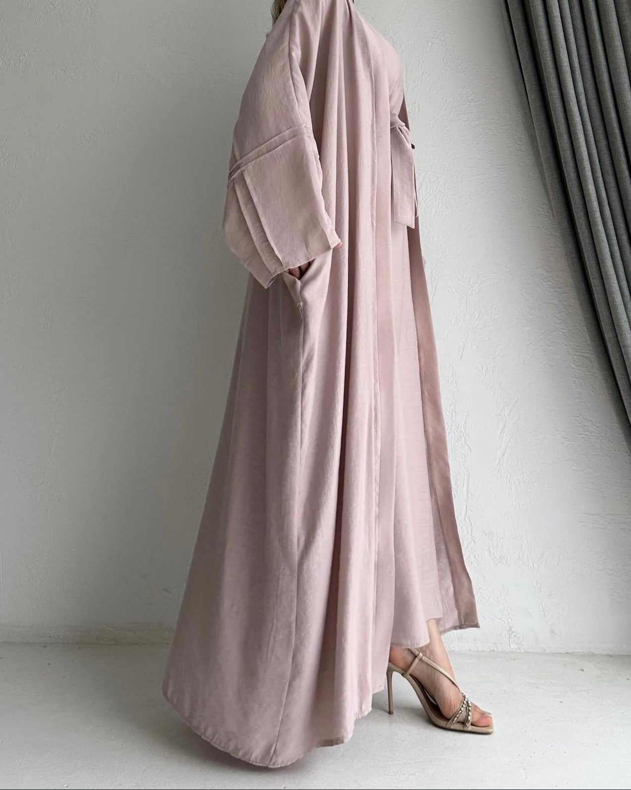 Introducing Sarah Collection’s Elegant flowy 2-piece Abaya Set, a perfect blend of modesty and sophistication, designed to keep you cool and stylish in the warmer months. This two-piece set features a sleeveless underdress and a flowing, lightweight kimono overlay, making it an ideal choice for both everyday wear and festive occasions.