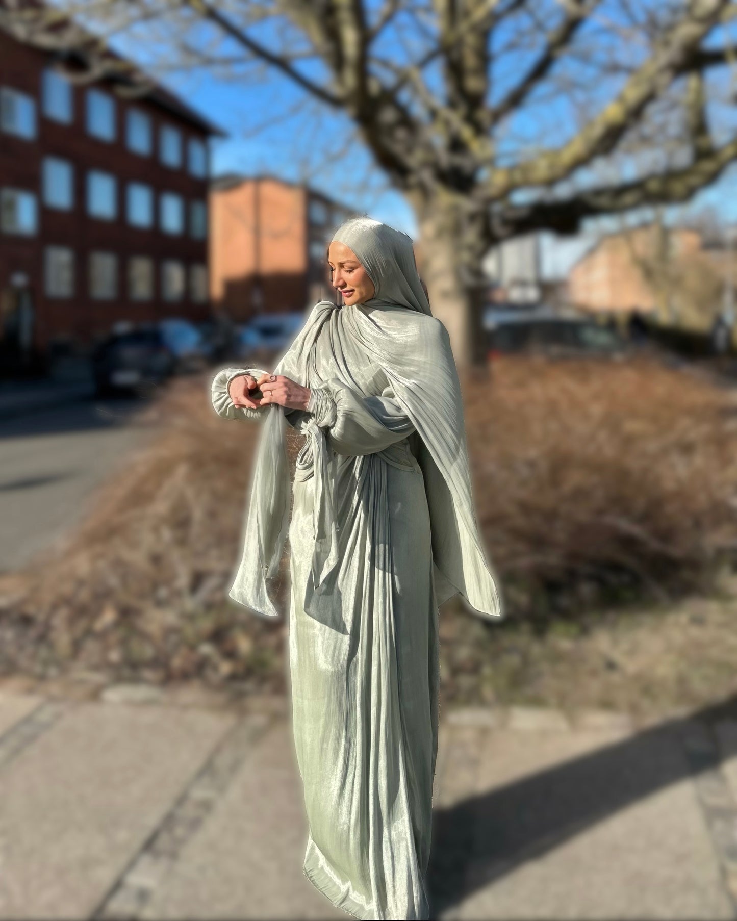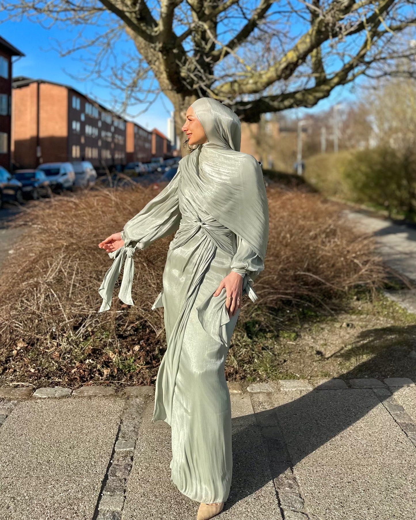 Make a lasting impression in this figure-hugging dress made from a light, shimmering fabric. The fine, lustrous material beautifully catches the light, adding a touch of sophisticated elegance, while the graceful fold at the front creates a timeless and flattering design. The flexible fabric allows for ease of movement, so you can celebrate in style and elegance. Perfect for special occasions or moments when you’re celebrating yourself.