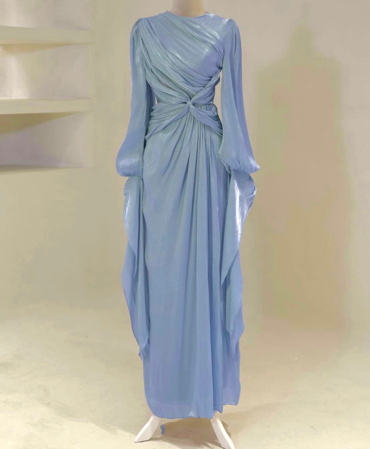 Make a lasting impression in this figure-hugging dress made from a light, shimmering fabric. The fine, lustrous material beautifully catches the light, adding a touch of sophisticated elegance, while the graceful fold at the front creates a timeless and flattering design. The flexible fabric allows for ease of movement, so you can celebrate in style and elegance. Perfect for special occasions or moments when you’re celebrating yourself.