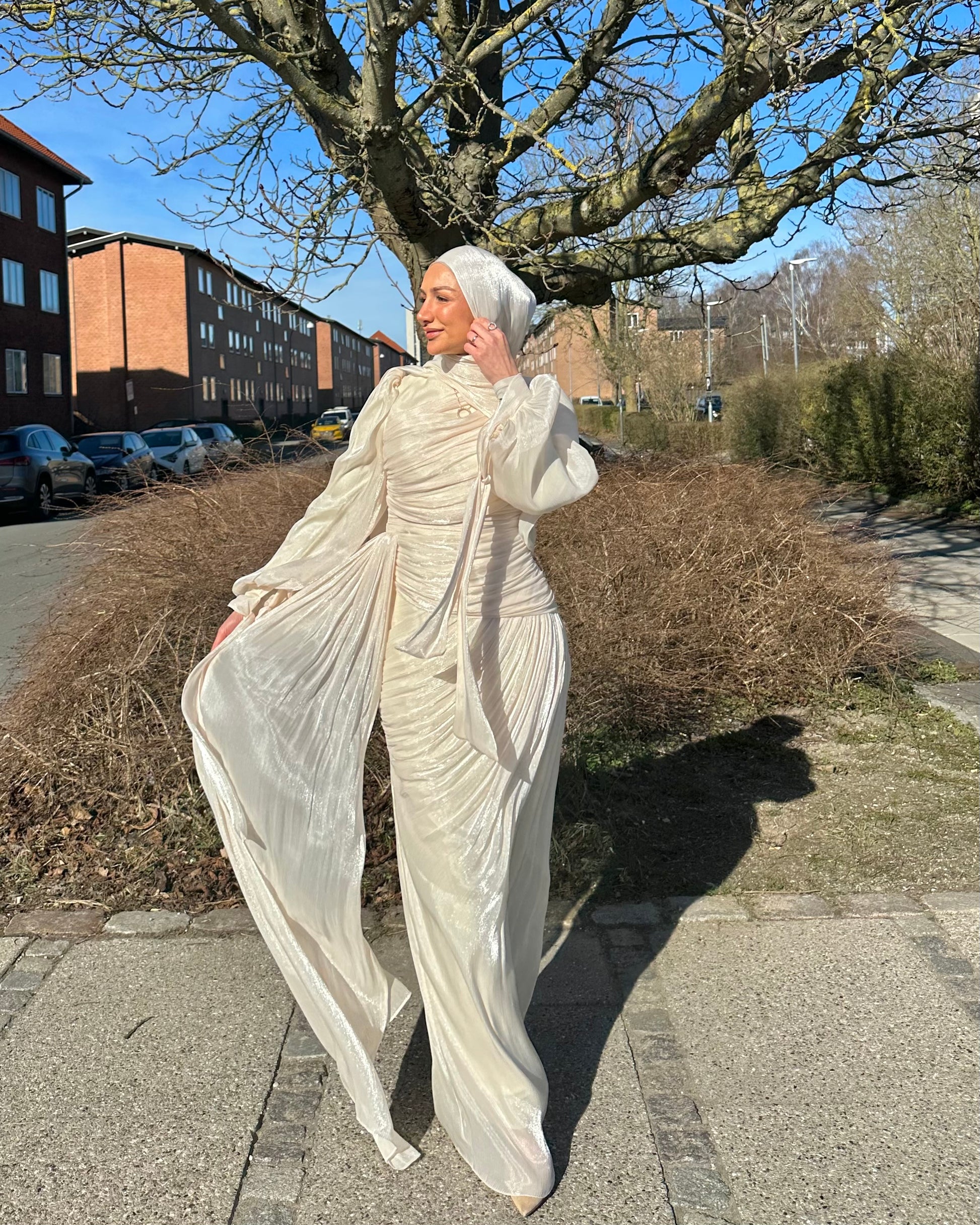 Make a lasting impression in this figure-hugging dress made from a light, shimmering fabric. The fine, lustrous material beautifully catches the light, adding a touch of sophisticated elegance, while the graceful fold at the front creates a timeless and flattering design. The flexible fabric allows for ease of movement, so you can celebrate in style and elegance. Perfect for special occasions or moments when you’re celebrating yourself.