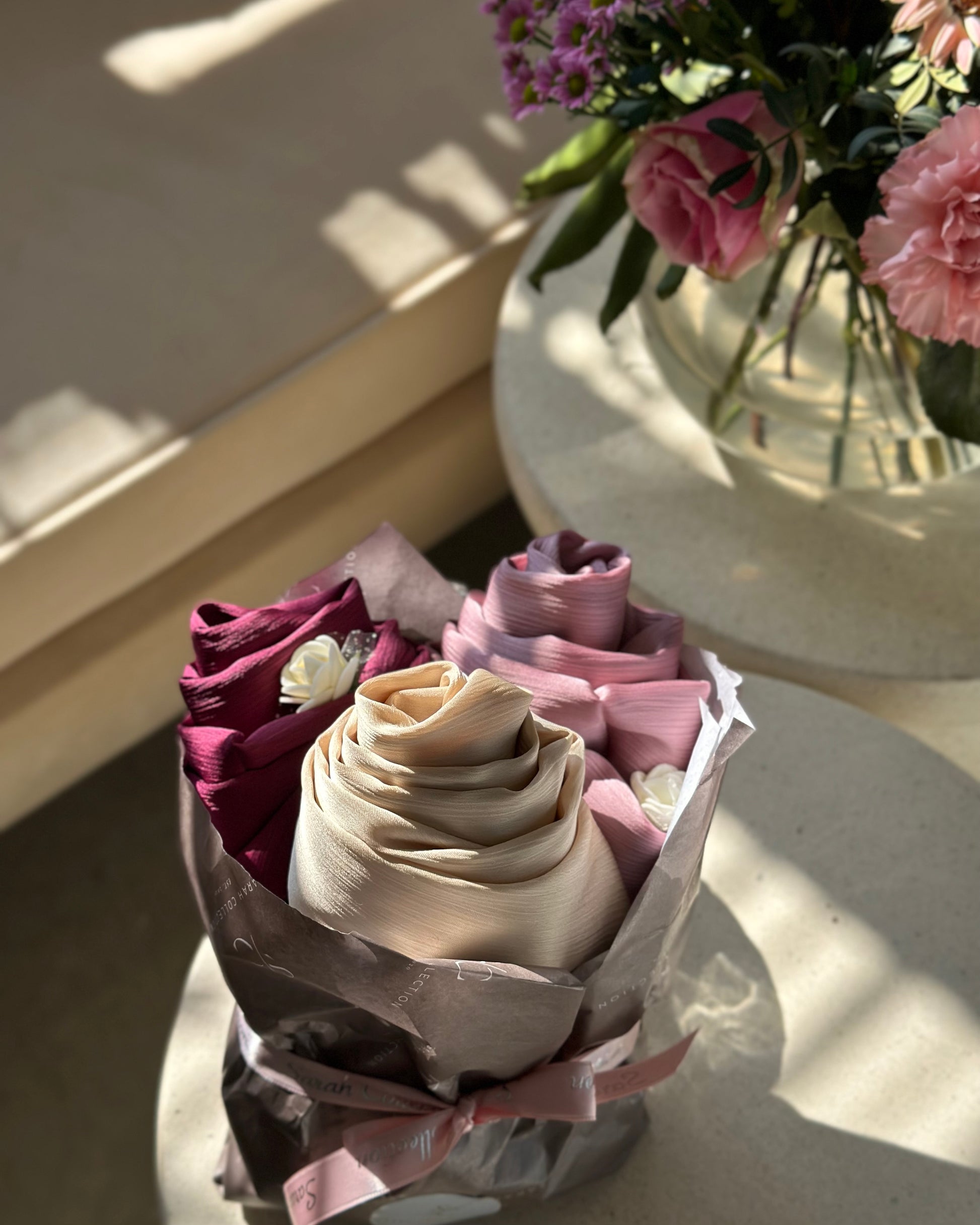 Overrask en du holder af med Sarah Collection’s unikke hijab-buket! Denne smukt sammensatte gave indeholder tre af vores luksuriøse Shiny Crincle Hijabs, rullet og arrangeret som en elegant blomsterbuket. Hver hijab er fremstillet af skinnende materiale, der falder smukt og giver et pift til hele outfittet.