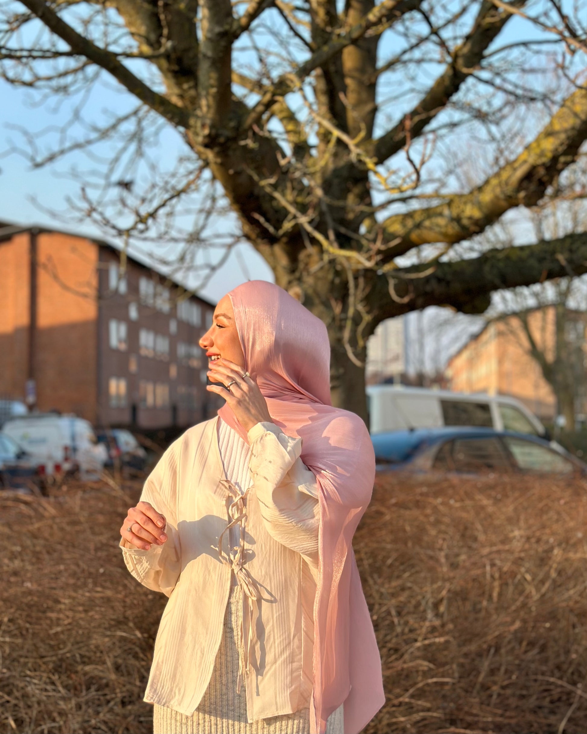 Sarah Collection's "Shiny Valentino Chiffon" er produceret i et let og løsvævet tekstil med et blødt greb og fint fald. Stoffet har et skinnede tekstur og giver et unikt look med dens naturlige glans. Dette tørklæde er perfekt til fine begivender.
