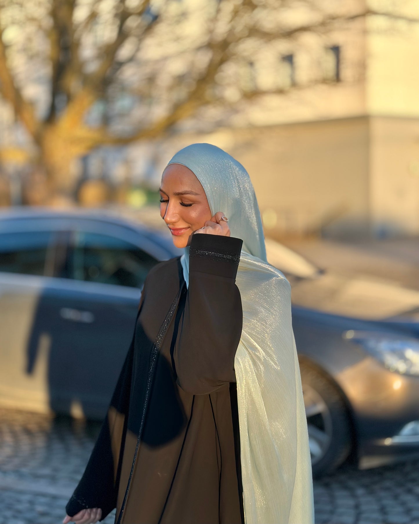 Sarah Collection's "Shiny Valentino Chiffon" er produceret i et let og løsvævet tekstil med et blødt greb og fint fald. Stoffet har et skinnede tekstur og giver et unikt look med dens naturlige glans. Dette tørklæde er perfekt til fine begivender.