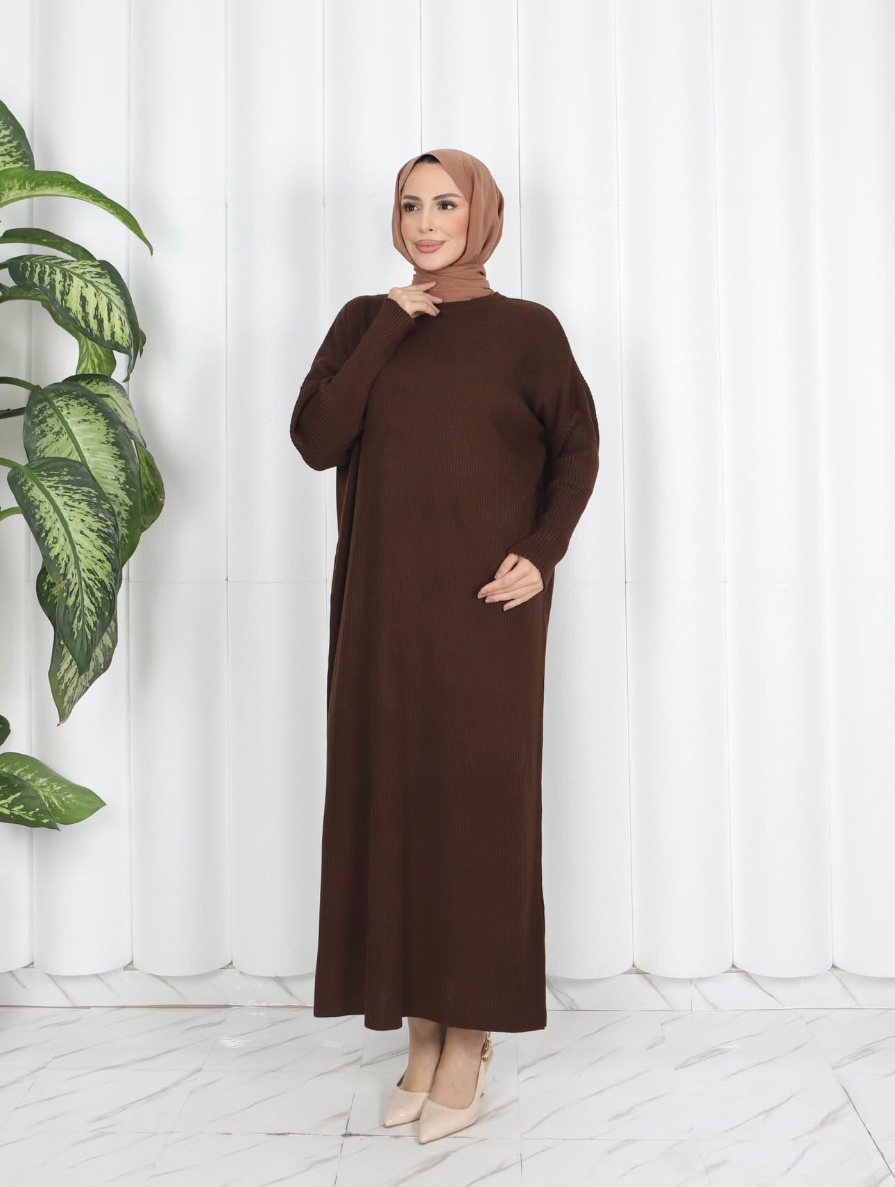 This outfit features a ribbed dress paired with a matching kimono, designed in the same color tone to create a cohesive and elegant look.